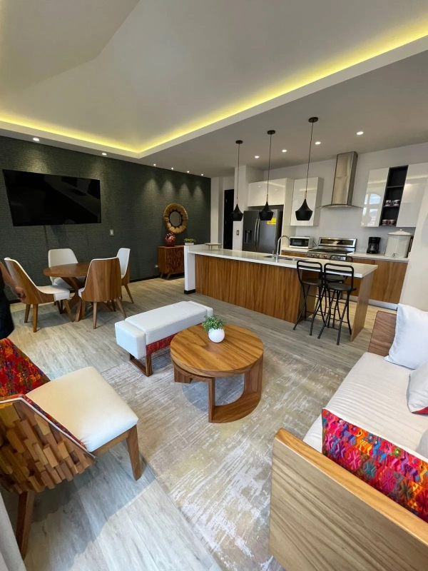 Lindo apartamento, amoblado y decorado, mide 96m2 Sala comedor con balcón. Cocina con isla desayunador. Habitación