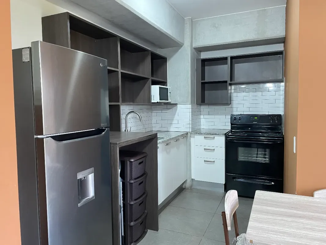 – cocina equipada con refrigeradora, estufa y horno microondas