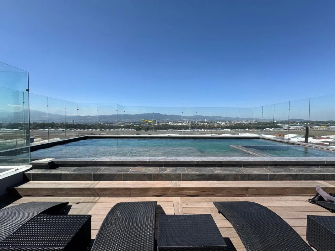– Piscina climatizada con vista a la pista del aeropuerto