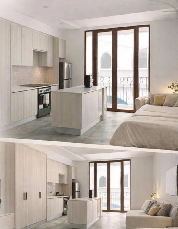 Diseño de espacio abierto, integrando dormitorio, sala y cocina en un solo ambiente moderno.