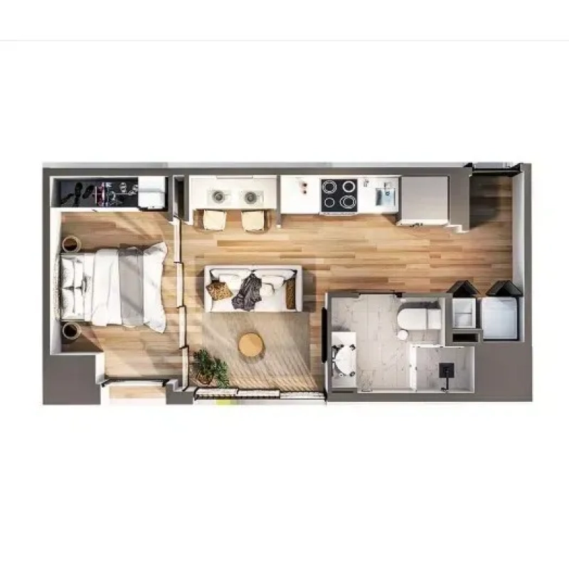 Lindos detalles, molduras en los zócalos y listel en el techo, piso imitación madera, top de cuarzo y gabinetes de cocina minimalistas sin jaladores.