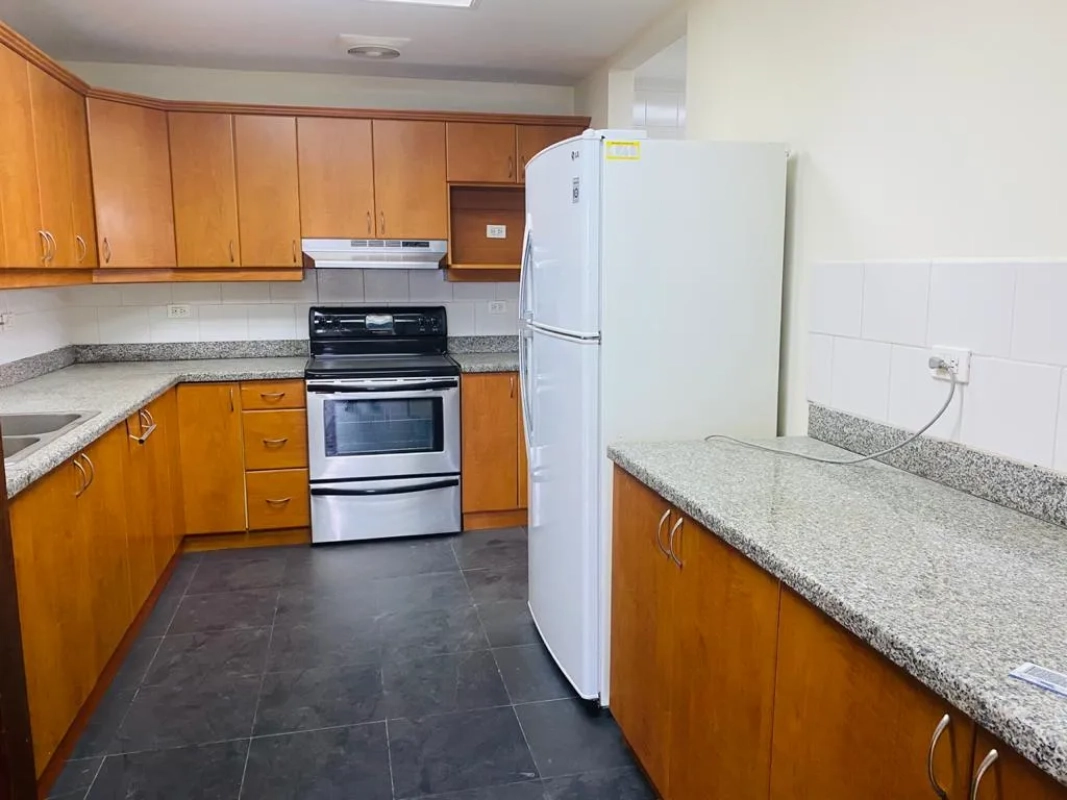 • Cocina con gabinetes y línea blanca