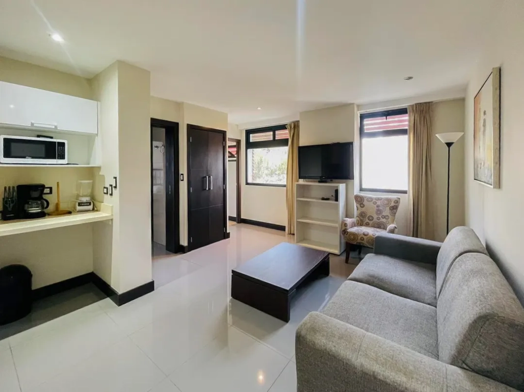 Apartamento de 56.82 m² con 1 habitación con aire acondicionado, 1 baño, sala–comedor, cocina con gabinetes, línea blanca y 1 parqueo.