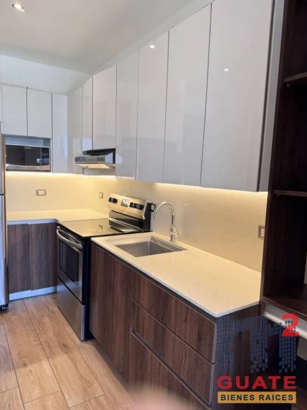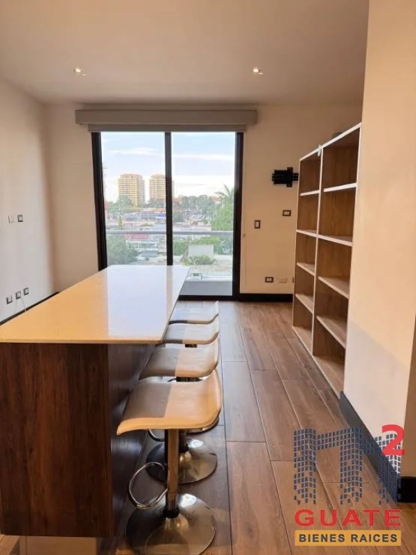 Apartamento tipo loft en zona 10 con excelente ubicación con 47 metros habitables más parqueo y bodega. 1 habitación con amplio closet y baño Cocina con desayunador, sala y balcón. Edificio con parqueos de visitas, piscina, business center, juegos para niños y gimnasio