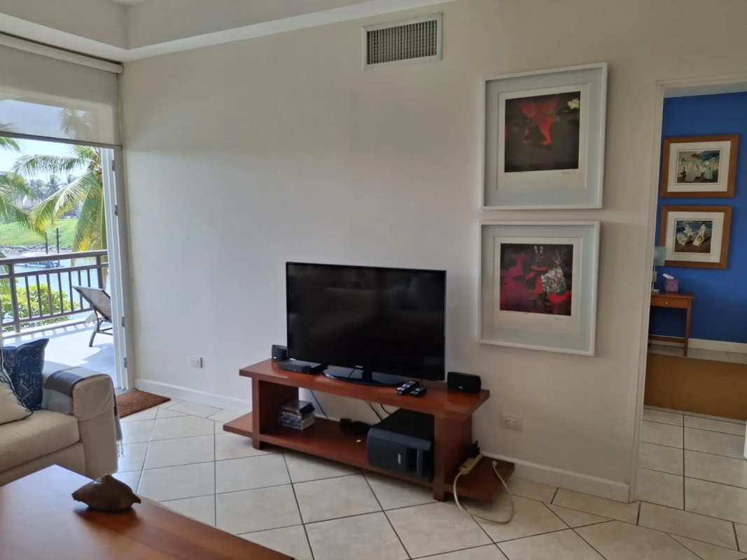 Amplia sala con TV y salida a un balcón con preciosa vista al canal