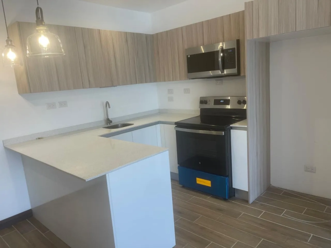 Cocina con gabinetes y desayunador