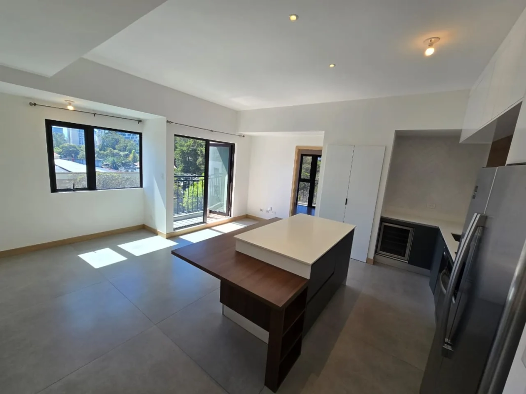 Sala con acceso a balcón, isla con comedor integrado, cocina con gabinetes y línea blanca completa.