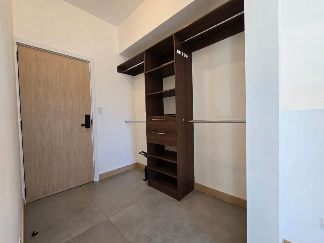 Acabados: Cocina con gabinetes de melamina y acrílico color blanco con top de cuarzo, baños con azulejo y mampara de vidrio templado, ventanas de PVC color negro y vidrio, Wolking-closet de melamina.