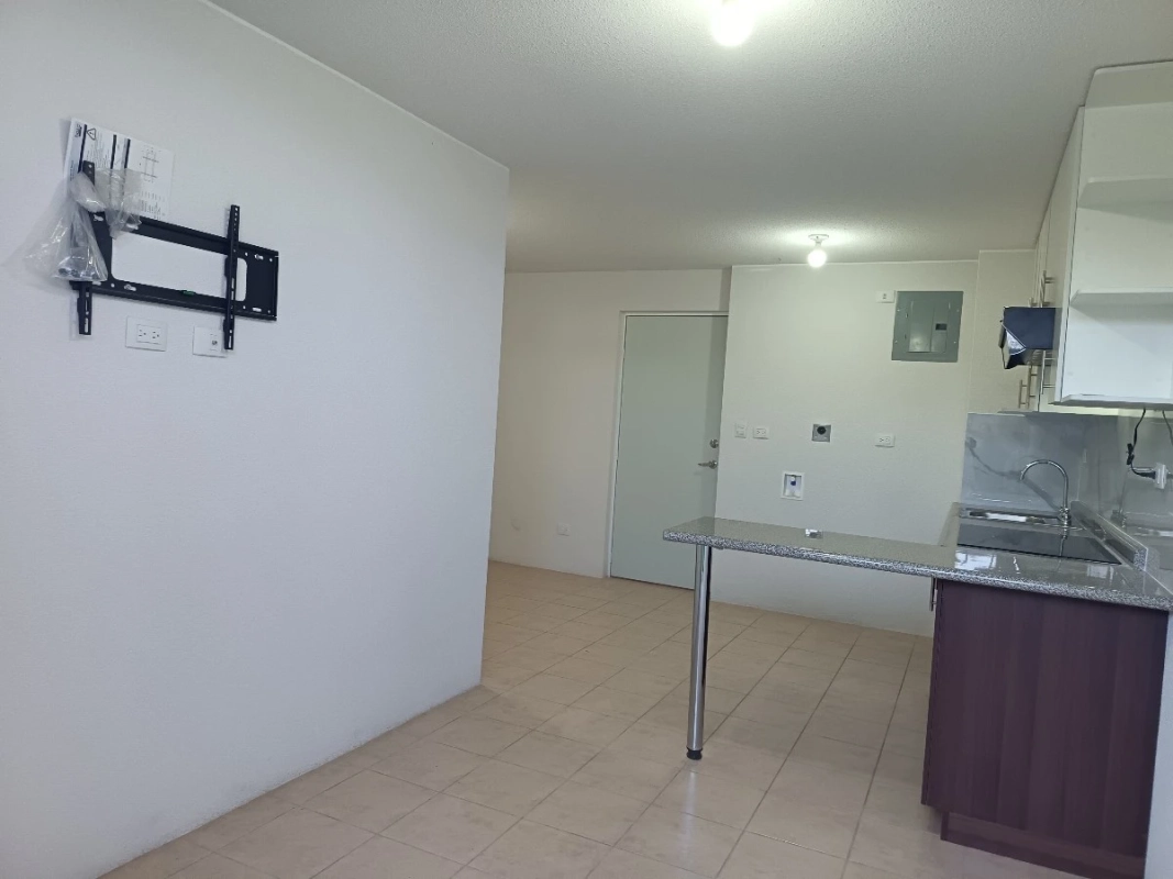 Sala, comedor y cocina con gabinetes y extractor de olores