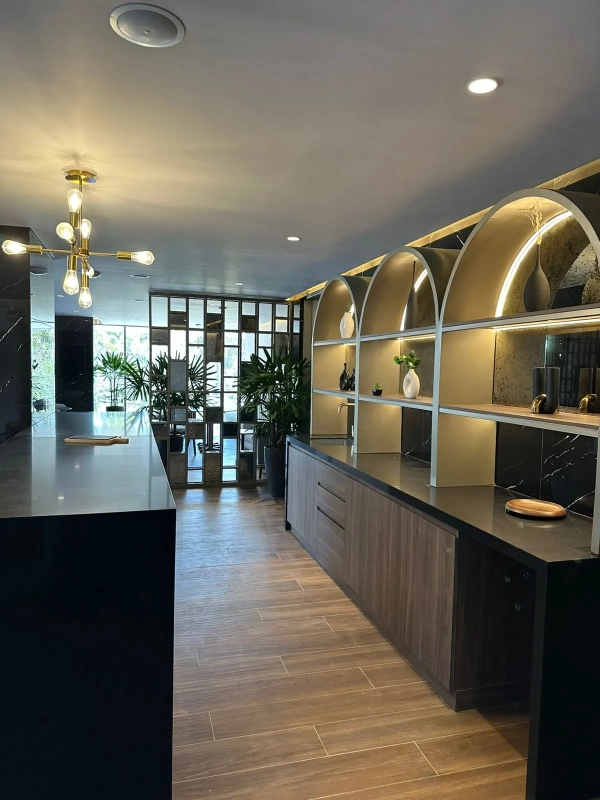 Cocina abierta, incluye estufa, microondas, refri. Calentador eléctrico.