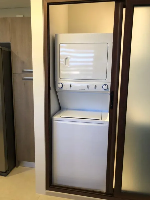 – Closet de lavado equipado con combo de lavadora y secadora tipo torre y lavatrapeador.