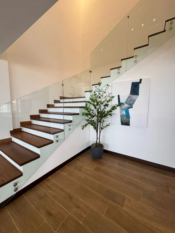 – ESCALERA MODERNA CON BARANDALES DE VIDRIO TEMPLADO