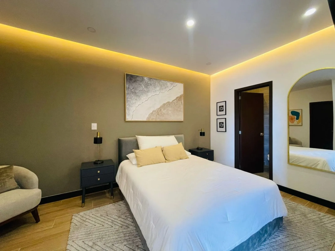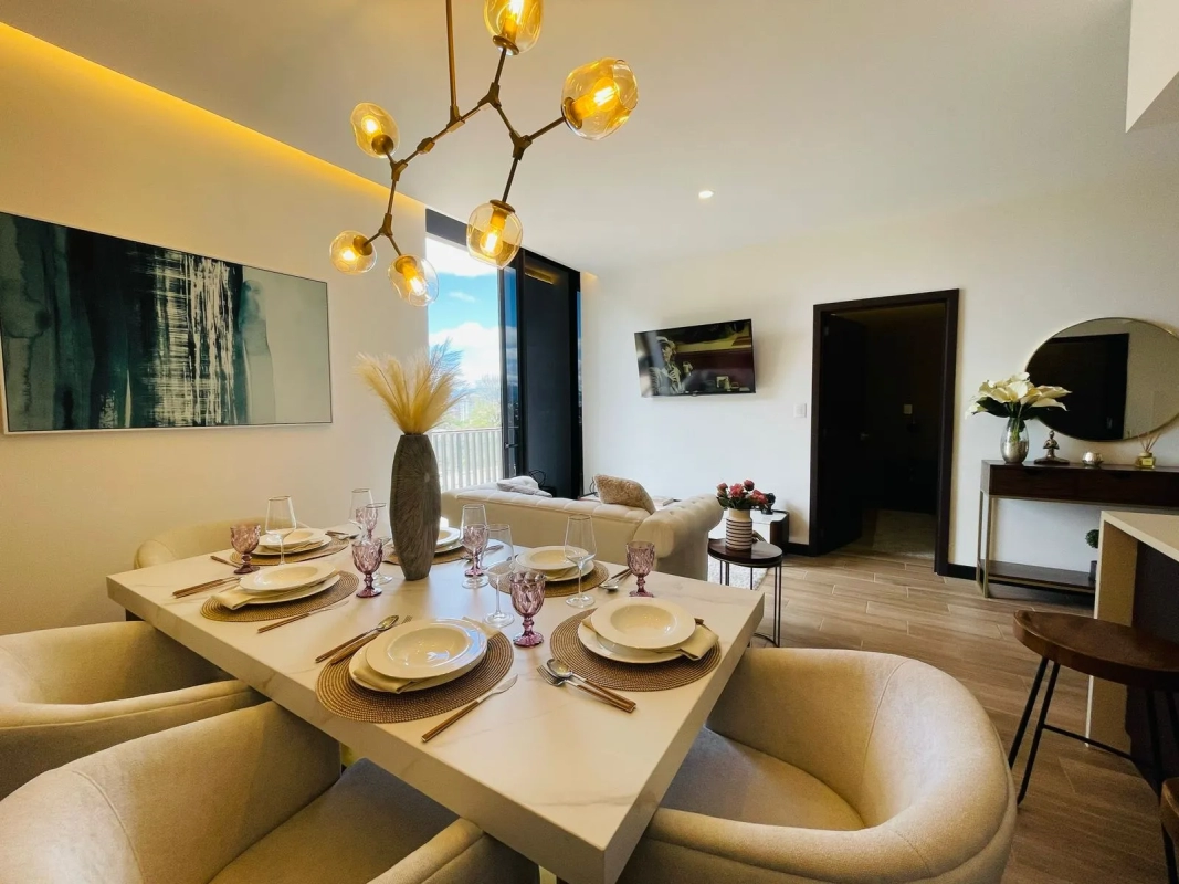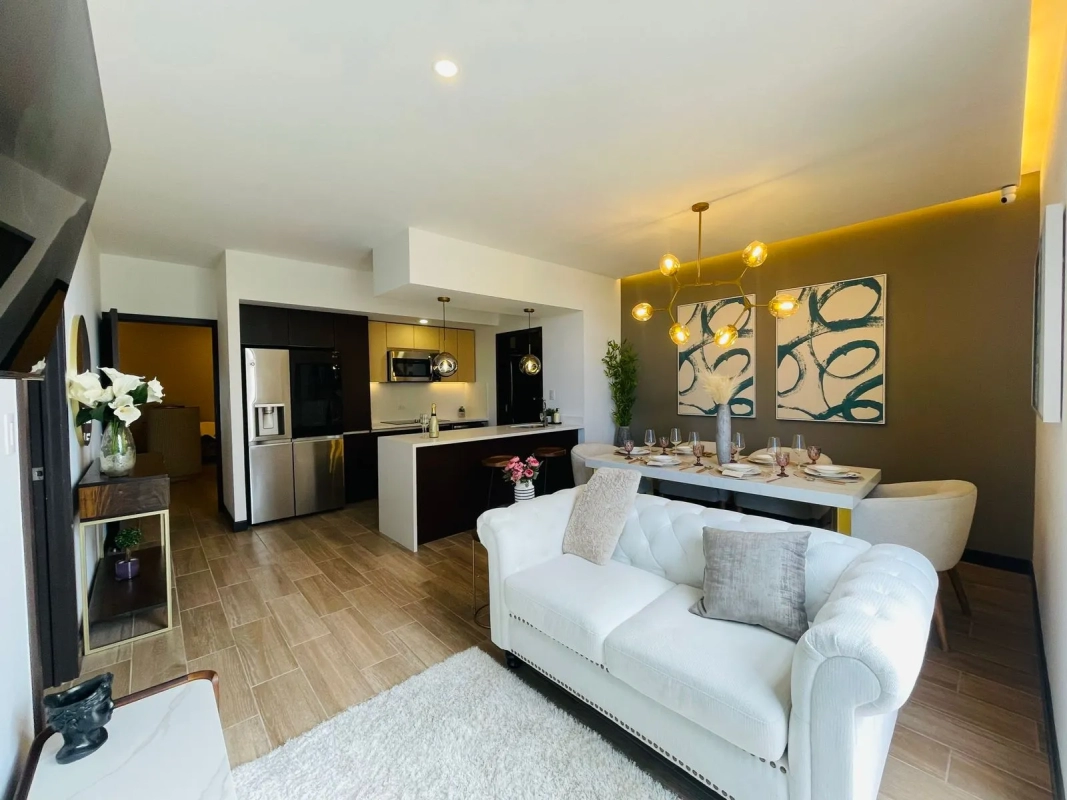 Cuentan con: sala, comedor con salida a balcón, cocina abierta, área de lavandería, baño completo, dormitorio principal con walk-in closet y baño privado, dormitorio secundario con closet, 2 parqueos.